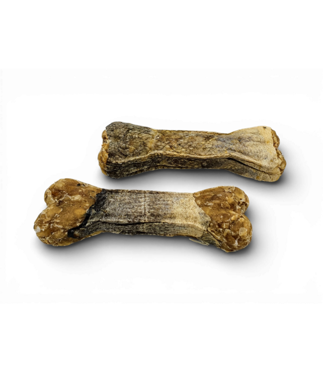 Dieser 12 cm lange Kauknochen ist ein wahres Highlight für alle Hunde, die Fisch lieben! Die Basis aus robuster Rinderhaut wurde mit feiner Dorschhaut umwickelt und mit einem Hauch Ochsenziemer veredelt. Diese Kombination sorgt für ein unwiderstehliches Aroma und macht den Knochen zu einer besonders hochwertigen Belohnung, die gleichzeitig wertvolle Vitalstoffe liefert.