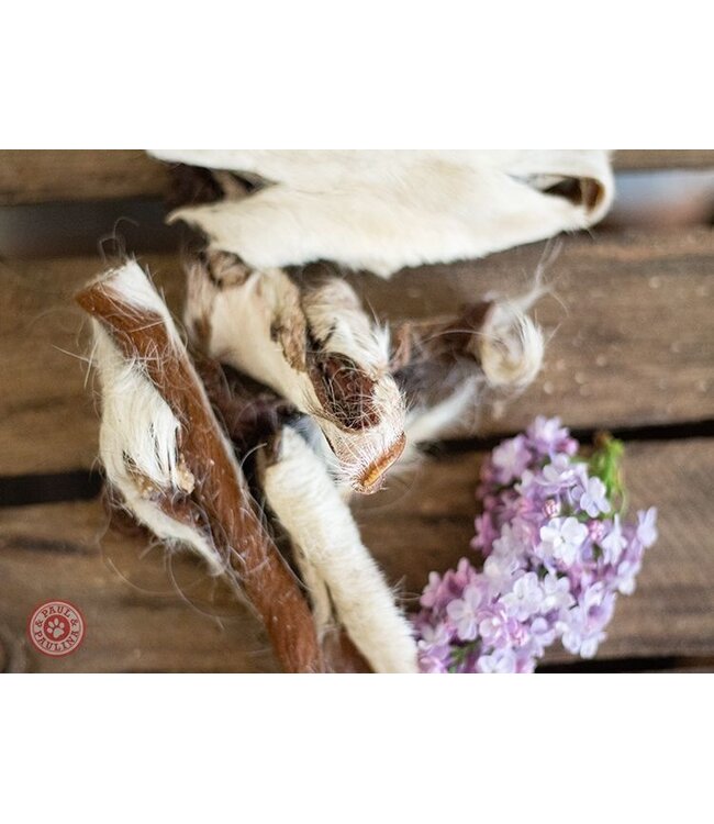 Diese luftgetrockneten Fellstreifen vom Pferd bieten eine naturnahe Beschäftigung und dienen gleichzeitig der Unterstützung der Darmpflege. Da Wölfe und Wildhunde ihre Beutetiere im Ganzen – inklusive Fell und Knochen – verzehren, entspricht die Fütterung von Fellstreifen dem natürlichen Beuteschema des fleischfressenden Hundes.